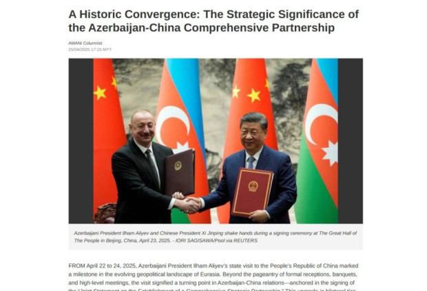 Malayziyanın aparıcı media qurumlarından biri olan “Astro Awani”də Beynəlxalq Münasibətlərin Təhlili Mərkəzinin eksperti Vüsal Quliyevin “Azərbaycan-Çin münasibətlərində yeni dövrün başlanğıcı” adlı məqaləsi yayımlanıb. Yazıda Azərbaycan Prezidenti İlham Əliyevin Çinə dövlət səfəri zamanı iki ölkə arasında hərtərəfli strateji tərəfdaşlıq əlaqələrinin qurulması haqqında Birgə Bəyanatın imzalandığı diqqətə çatdırılıb, ikitərəfli münasibətlərin, strateji əməkdaşlığın yüksək səviyyəsi bildirilib.