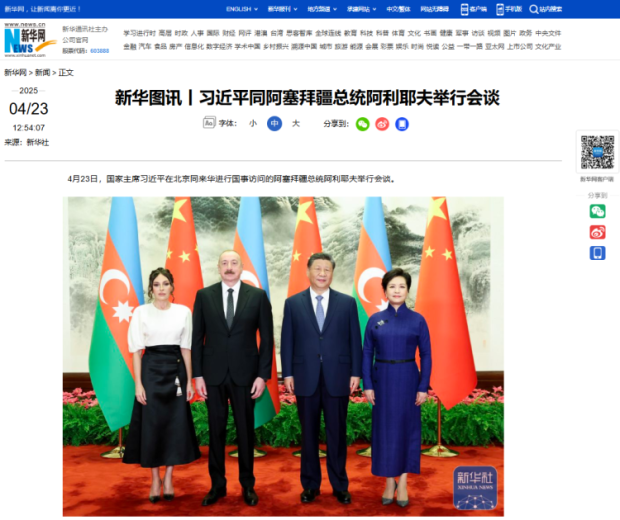 Çinin milli xəbər agentliyi olan Sinxuanın “Si Cinpin Azərbaycan Prezidenti İlham Əliyevlə danışıqlar aparıb” başlıqlı məqaləsində deyilir ki, beynəlxalq vəziyyətin dəyişməsindən asılı olmayaraq Azərbaycan-Çin münasibətləri öz inkişaf dinamikasını qoruyub saxlayıb, iki ölkə qarşılıqlı hörmət, bərabərlik və qarşılıqlı faydalı əməkdaşlıq prinsipləri əsasında inkişaf edərək, strateji tərəfdaşlıq səviyyəsinə yüksəlib.
