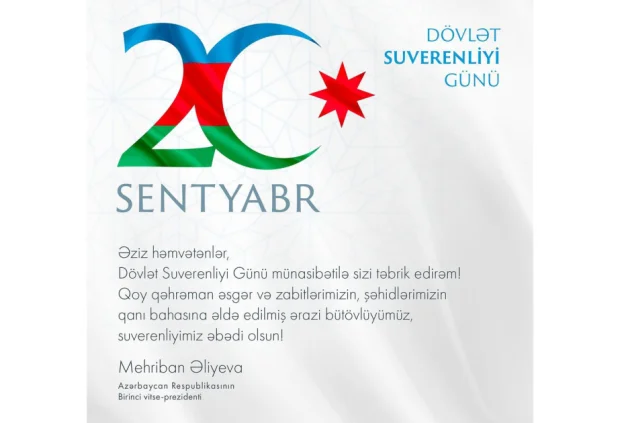 Birinci vitse-prezident Mehriban Əliyeva Dövlət Suverenliyi Günü münasibətilə paylaşım edib