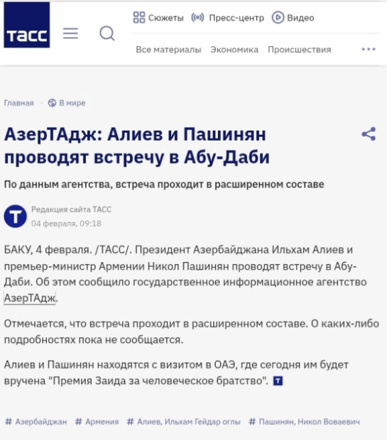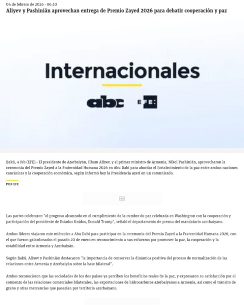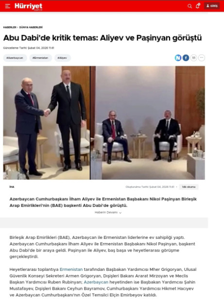 Həmçinin bildirilib ki, Azərbaycan Prezidenti İlham Əliyev və Ermənistanın Baş naziri Nikol Paşinyan fevralın 4-də Birləşmiş Ərəb Əmirliklərinin paytaxtı Əbu-Dabidə 2026-cı il “Zayed İnsan Qardaşlığı Mükafatı”nın təqdimolunma mərasimində iştirak ediblər. Mükafat bu il hər iki liderə təqdim olunub.
