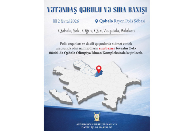 Polis orqanları və daxili qoşunlarda xidmət etmək arzusunda olan namizədlərin sıra baxışı vətəndaş qəbulundan əvvəl, yəni fevralın 2-si saat 08:00-da Qəbələ Olimpiya İdman Kompleksində keçiriləcək.