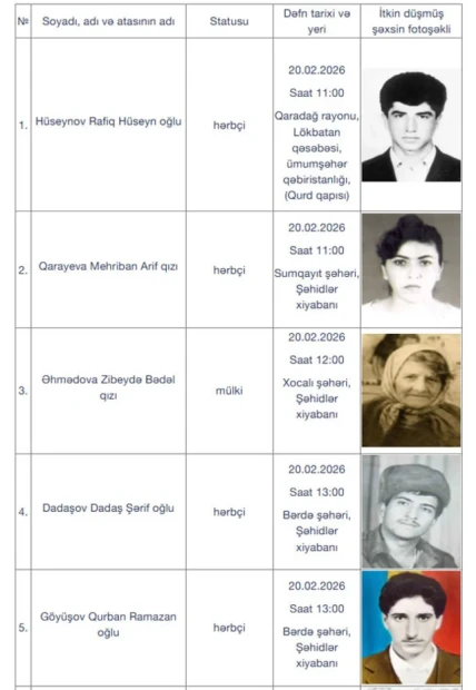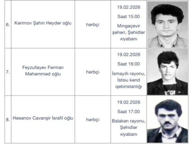 Bildirilib ki, şəhidlərin nəşinin qalıqları 19 və 20 fevral tarixlərində dəfn ediləcək